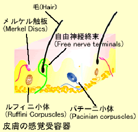 端にある。機械的、化学的、温熱的刺激のいずれにも反応する。皮下に多