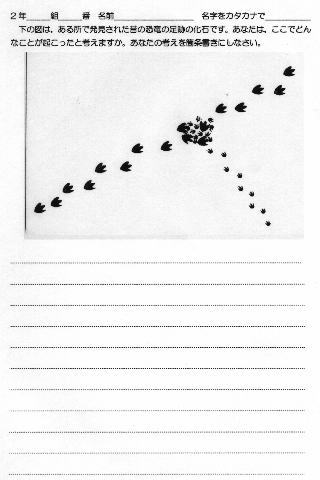 そのことは「創造」の力を育てることにもなります。ここでは,恐竜の足跡のプリントからここで起こったことを想像させました。これは,毎年初めての生徒にやらせる作業です。奈良学園で高校地学を教え始めたときに書かせたことについては,平成13年4月10日更新の「大きな恐竜と小さな恐竜」に書いています。