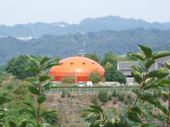 奈良県を縦断する国道168号線を左に折れ,柿畑の中を上って行くと,高さが8.7m、直径が18.2mという巨大な柿が現れました。これが奈良県果樹振興センターの施設の1つ,柿博物館です。