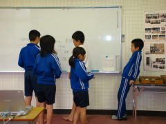 今度は「○○君のおじいちゃんのお墓の重さはいくらだろう」が話題になりました。「えーと,体積を求めるには?」,そして,縦・横・厚さを測って体積を求めました。そして,お墓の石が標本の何倍であるかを計算で求め,おじいちゃんのお墓の重さが分かりました。