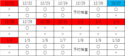 通常診療は12/29の午前までです。また年始は1/5より通常の診療へ戻ります。ご迷惑をお掛けしますがよろしくお願いいたします。