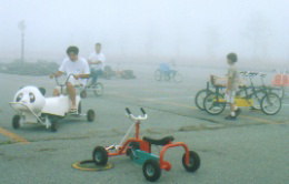 | 2日目、この日はあいにくのお天気。朝からぱらぱらと小雨が・・・ 清里ハイランドパークへ、行ってみましたが、すごい霧! そんな中、男性軍は、変わり自転車で遊びました。 良い天気ならすごく良い景色が見えるはずなんだけど。残念。 |