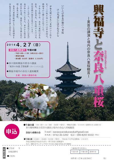 | ●興福寺と奈良八重桜 ◎日程:2014年4月27日(日)午前10時〜11時(雨天実施) ◎場所:興福寺会館 9時30分〜受付 ◎参加費:500円 ◎募集人数:先着80人 [内容] ■多川俊映興福寺貫首の講演「東洋の知恵『菜根譚(さいこんたん)」 ◆興福寺境内の奈良八重桜観賞 [主催]奈良八重桜の会 申し込みは E-mail:naranoyaezakuranokai@gmail.com FAX:0742-36-5292 ●同日午後から「奈良八重桜巡り」のイベントがあります。 ◎日程:2014年4月27日(日)13:00〜16:00(雨天中止)※桜の開花状況にかかわらず開催します。 [主催] 奈良市、旧鍋屋交番と奈良きたまちの会、なら・観光ボランティアガイドの会、転害門前旧銀行建物活用協議会 [後援] 奈良女子大学 ※ホームページからも申し込むことができます。http://www.kitamachi.info |