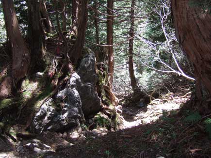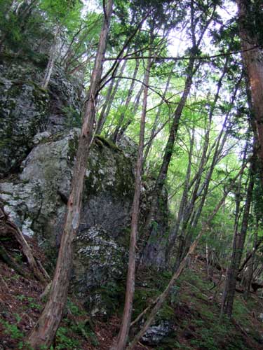 上谷分岐で柏木への道を分け、尾根沿いに植林帯から混合林になり、若葉降りしきる清清しい自然林です。大きな岩やブナ、カエデ、ヒメシャラなどで緑があふれ、苔むす岩に小さな白い花が蕾を揺らせ、滴る岩清水がキラキラ光っています。