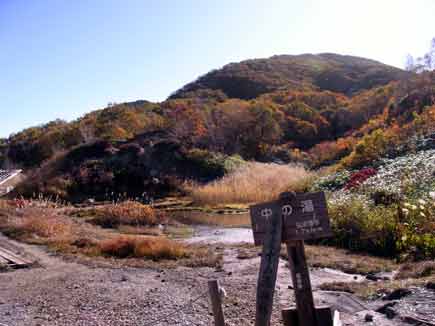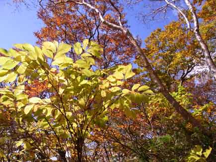 中の湯から高度を上げて行きます。ダケカンバやナナカマドなど混合林になりオレンジや黄色、赤と華やかな彩りになり、秋の実も見られ秋本番真っ只中です。