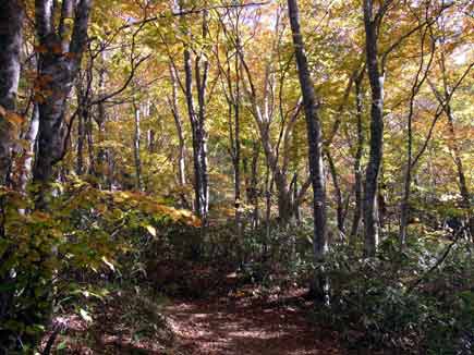 快適な黄葉のブナ林が続き中の湯までは緩い上りで遊歩道の感です。今は営業していませんが、当時は車が通ったのでしょう。