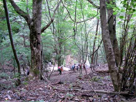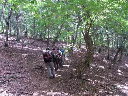 木漏れ日の爽やかなブナ林をお行儀良く並んで行きます。ブナはまだまだ緑の葉をさやさやと揺らせています。