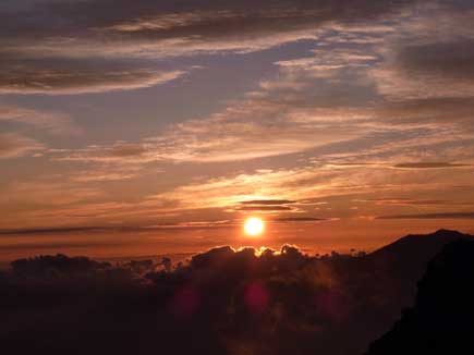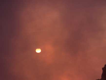 ヴェールを脱いだ太陽は最後の強烈な赤い光を投げかけて、燃えて、消えて、小さく、山の端に落ちていきます。(18:35)