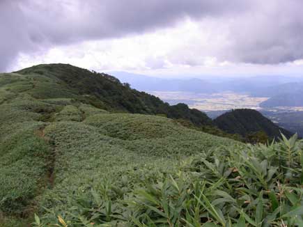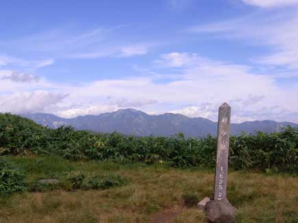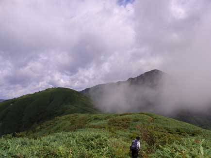 樹林を抜けると笹原の快適な稜線歩きです。ガスも晴れて展望は抜群、なだらかな稜線はほんの少し秋の匂いです。