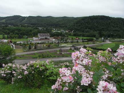 香りの里ハーブガーデン↓斜面いっぱいにサクラバラが咲いて「童話村たきのうえ」を演出しています。まさにおとぎのくにでした。