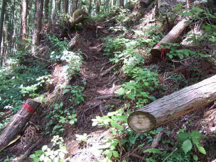 稜線から下ると植林帯に入り、展望なく稜線の爽やかさに比べると時間的なこともあり暑いです。