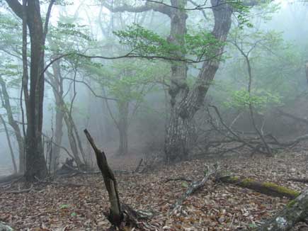 少しガスが出て白い幻想の森になりました。ガスの中、遠目にぼんやりツツジの色を見るのもいいものです。