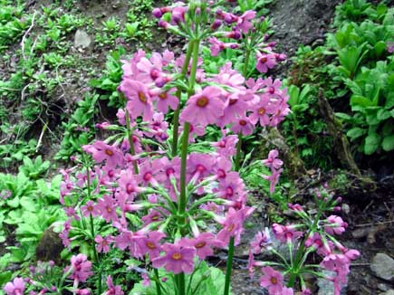 いくらも歩かないうちにもう流れの縁にクリンソウが咲いています。あっちにもこっちにも清流の中にピンクのクリンソウと緑の大きな葉は一際目を引きます。