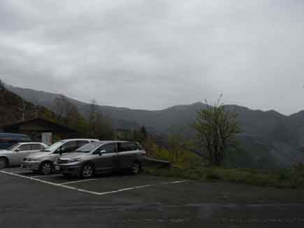桑瀬峠を見下ろします。遠景の山並み右方に伊予冨士、瓶ヶ森方面ですがちょうどガスの中で見えません。↓