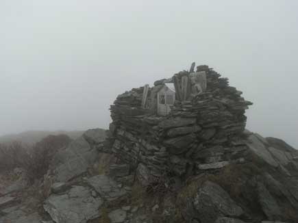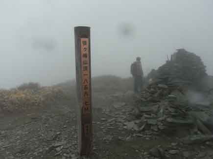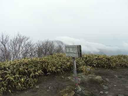 山頂は広く石積みの中の祠、ケルン、案内板、一等三角点、山名標示杭があるだけであとは笹原です。素晴らしい展望が望まれるのでしょうが、今日は吹き飛ばされそうな風、風を避けるものはこの祠だけでその前にうずくまっていました。少し離れるとメンバーも見えなくなり不安になります。