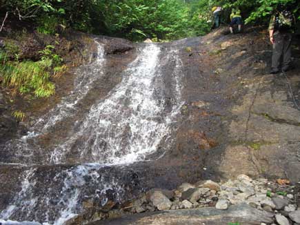 コース中唯一のナメ滝、ツルツルと岩を這うように流れています。右にロープがあり足がかりもあるのでOKです。