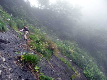 濡れているので滑りやすいですが、鎖が手の届く範囲にいくつもありますので大丈夫です。この岩場は花畑、ギボウシやシモツケソウが斜面いっぱいです。