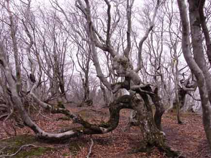 強風、積雪など過酷な条件下で極端に変形したブナが多くまるで踊っているようです。