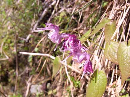 落葉の中からミツバオーレンの花、またまた登山道を塞ぐイワウチワの大群落、ショウジョウバカマ、イカリソウ、たくさんのお花に出合う花尾根