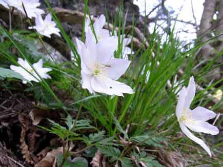 リーダーに見つかったら怒られそうな(リーダーは先を歩いていた)急斜面をズルズル滑りながら上がって撮ったのがこれ、キクザキイチゲ?その変種のヤブイチゲ?花がとても大きいです。清楚な目にいたい白さがとても印象的でした。