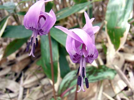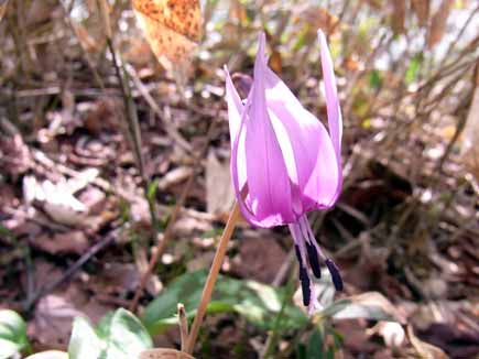 カタクリ発見!笹の中からカタクリが笑顔のイナバウアーです。