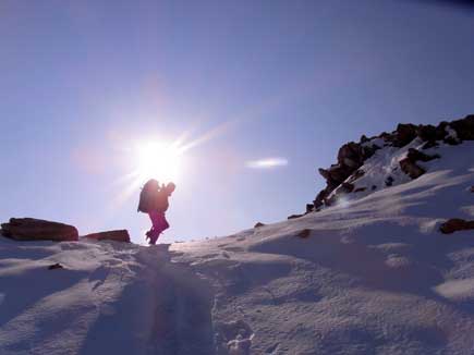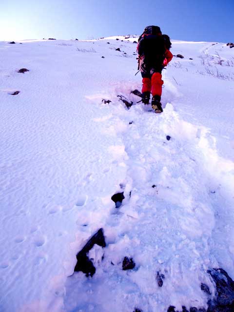 雪と空、白とブルー、この上なく美しいコントラストの中、1歩1歩慎重に雪を踏みしめて行きます。