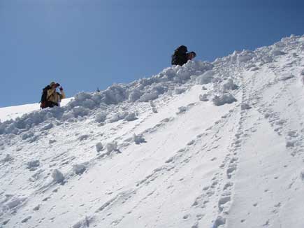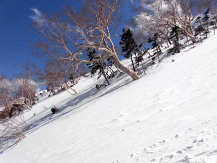 あんなに苦しかった雪渓も下りは半分滑って、たわいなく雪と遊びながら下ります。
