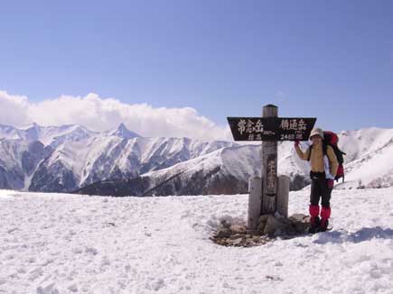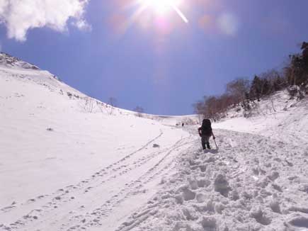 登山口(標高1260m)から小1時間も歩かないうちに雪道になり、スパッツとサングラスを慌てて装着します。怖いほどの日差しに何年か前のGW、立山で全員メガネザルになった苦い経験を思い出しました。