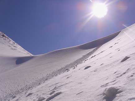 下から不気味に見えていた雪庇も夕陽に照らされてこんなに美しい!動に変わらなければ雪庇も今は美しく静なる雪です。