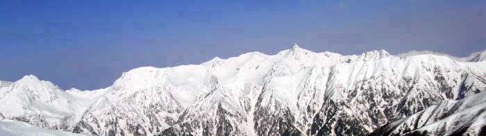 朝日に輝くアルプスの山々、1点の曇りもない紺碧の空、光を映す雪、幻想の雪紋、フゥ〜っと軽い目まいを感じ次の瞬間我に返る。