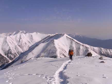聞くところによると昨日吹雪いて4〜50cmの積雪があり、常念から先のトレースがないとのことで少し不安がよぎりますが、今日はたくさんの人が上がっているのでとにかく常念までは大丈夫でしょう。ところどころ先客が雪を踏み抜いた大穴があり、それは殆ど足が全部埋まってしまう深さです。脱出が大変だったでしょう。