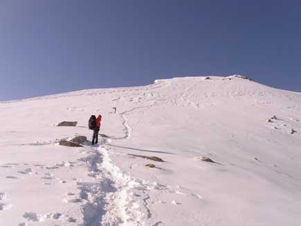 あの白く光る稜線まで…、あの紺碧の空まで…、あの夕陽まで…、と言いながら数歩歩いては大きく息をつき、だんだん周りを見渡す余裕もなくなりただ足元を見つめるばかりです。