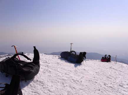 昨夜はかなり寒くて風が強くテントがパタパタしていました。今まで雪のテントでもシュラフとカバーで寒いと思ったことがなかったのに昨夜は初めて寒いと感じました。テントの中のザックに入っていたお茶がシャーベット状に凍っていましたからかなり気温は下がったのでしょう。もちろん靴もテントの中、昨夏テントの中でカメラが水没した経験上カメラはシュラフの中です。