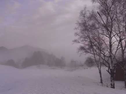 ゲレンデが光り 山が目覚める冬の朝 靄る朝