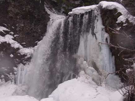 氷が割れ落ち滝つぼに落ちて あとは雨音と流れの音