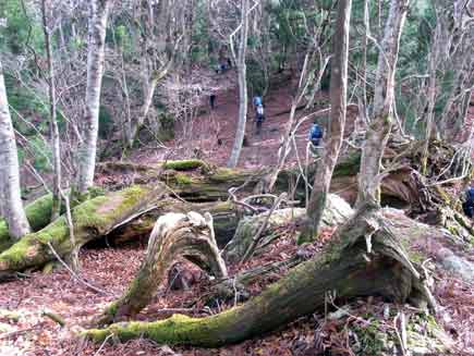 倒れた木には何種類もの木が寄生して雑木の集合体みたいになっています。こんな光景も多いです。(ナースログと言う)