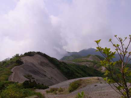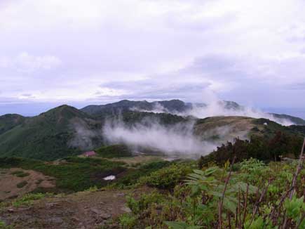 翌日の予報は曇り夕方から雨ということで早い出発にします。山荘を出る時は小雨とガスで視界も悪く、いやな雰囲気ですが何とか夕方まで雨は落ちて来ないで〜と天に願いをかけて出かけます。