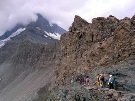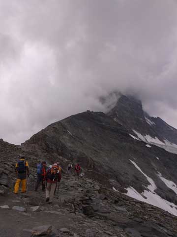 いったん鞍部に下りそこからオーバーロートホルンへの登山道、標識があります。ガイドさんから遠くで雷鳴がしているから、私の判断で引返す場合もあります、と説明がありました。私には雷鳴は全くきこえませんでしたが、空模様は芳しくなかったので仕方ありません。