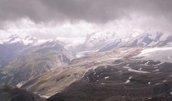 大スケールのミシャベル山群、霞むモンテローザ、クラインマッターホルン、その間にいくつもの氷河、そして頭上はマッターホルンととても貴重な、かけがえのない時間でした。雲に覆われていたのがとても残念です。