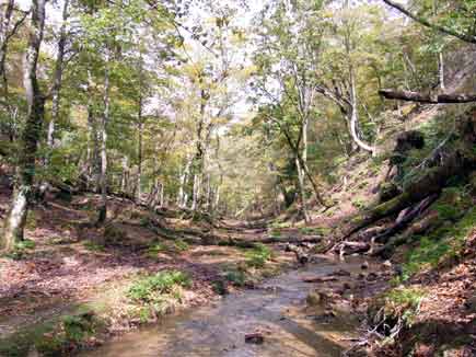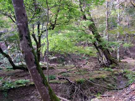 小さな流れを何度も渡り返し、ブナの巨木を見上げ、大きな倒木をまたぎ、原始の匂いが残る森です。