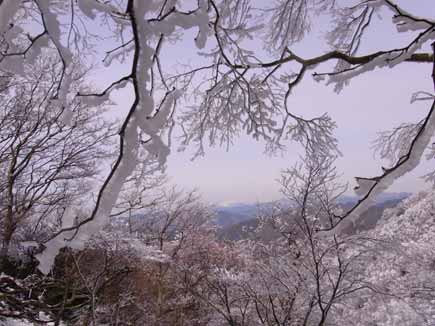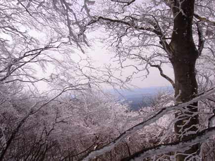 竜王山分岐から高低差140m急階段の激下りです。こちらの斜面もしだれる樹氷とエビの尻尾です。