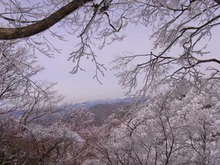 山頂へ歓声を上げながら樹氷をくぐっていくのですが、やや気温が上がって氷が容赦なく落ちて来ます。仕方なく首にタオルを巻いて防御します。