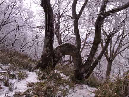 雪の重みで曲がり変形してアーチになった「幸福ブナ」このアーチをくぐると幸せになると書いてあったのでもちろん全員くぐります。