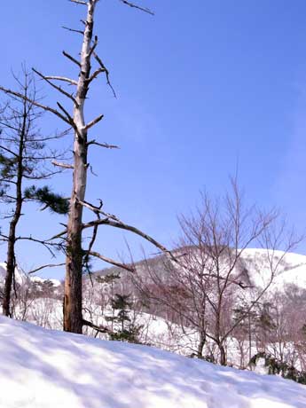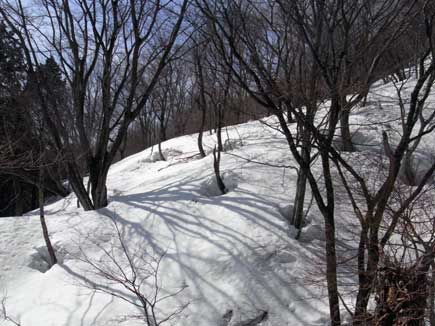 登山口から30Cほどの積雪で登山道からはずれるととたんに膝まで埋まってしまい、甘くかまえてわかんを車に置いてきたので何度も踏み抜きました。