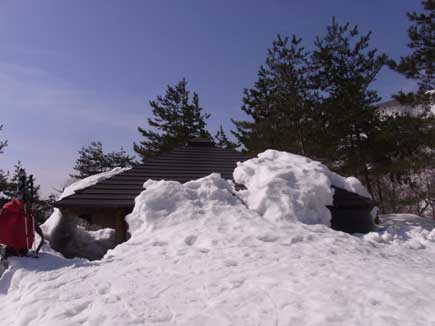 ブナの木平の東屋はこんな状態。スノボーの先客が一人、これを持ち上げて下りはあっと言う間におりるのかな?
