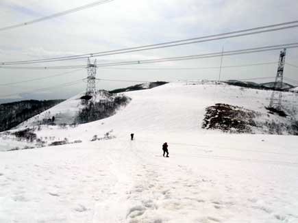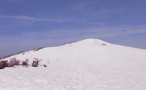 今日は快晴、下界も4月中旬並みの暖かさだったとか、赤阪山もさすがに雪はかなりゆるんでいましたが山頂があんなに丸くて緩斜面で雪遊びにピッタシ!だなんて何度も来ているのに知りませんでした。大発見でした。