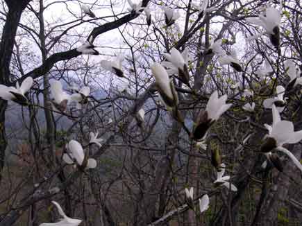 鍋倉山からの下り広大なブナ林に真っ白のタムシバが見事に咲き、イワウチワの群落もあり花尾根です。黄色はマンサク、ダンコウバイ。