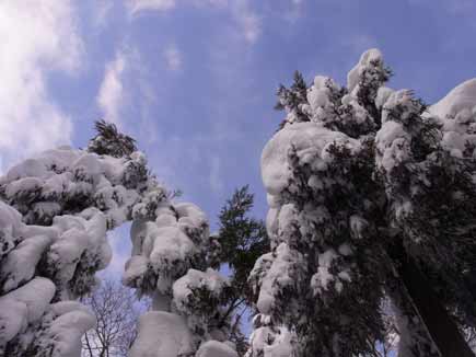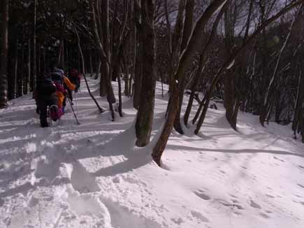 多分本来の尾根より一つ南の尾根を上がったようです。ところがこの尾根ハンパじゃない上りで積雪は80cくらい、ピッケルは完全に埋まるし、かなり急勾配であえぎ、あえぎ、転んだり、滑ったり、埋まったり、で少々難航しました。