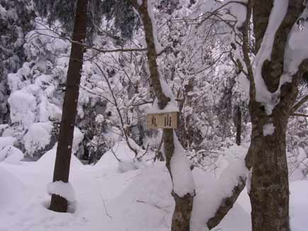 佐目の集落もどっぷり雪です。登山口には「つかって舎」と書かれた東屋があり、ここで最終装備をチェックします。「つかって舎」も雪をふんわり積もらせて雪国のポスターを見るようです。