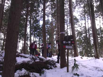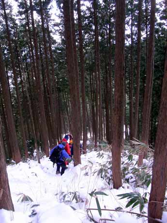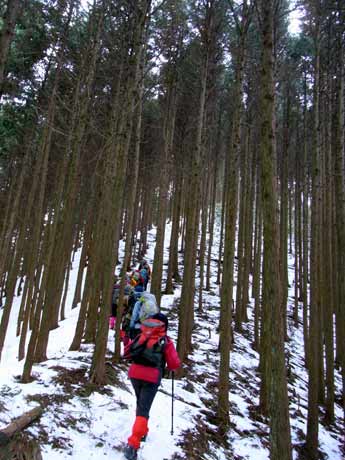 寒い、寒い杉木立の中、いく度かアップダウンを繰り返し最高峰熊ヶ岳が樹林の間に見えて来ます。